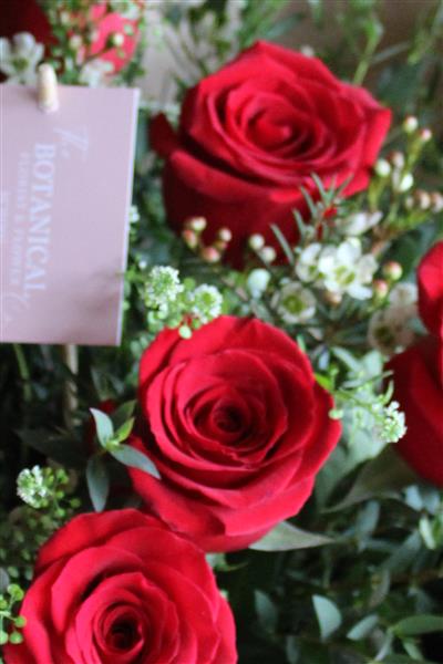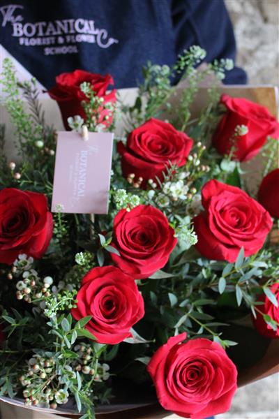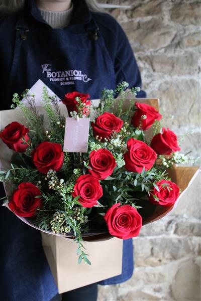 12 Beautiful red roses expertly hand tied and complimented with winter foliage's.