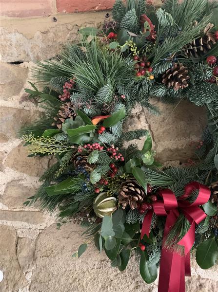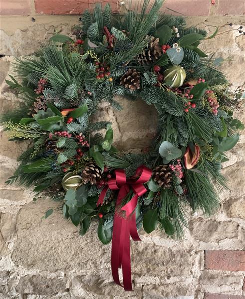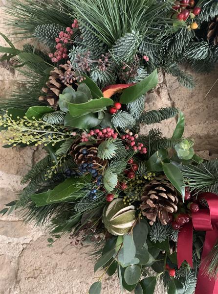 Our traditional Luxury Winter Berry Door Wreath design has gleaming crimson berries as well as festive fir, branches, and pinecones finished a gorgeous satin ribbon.