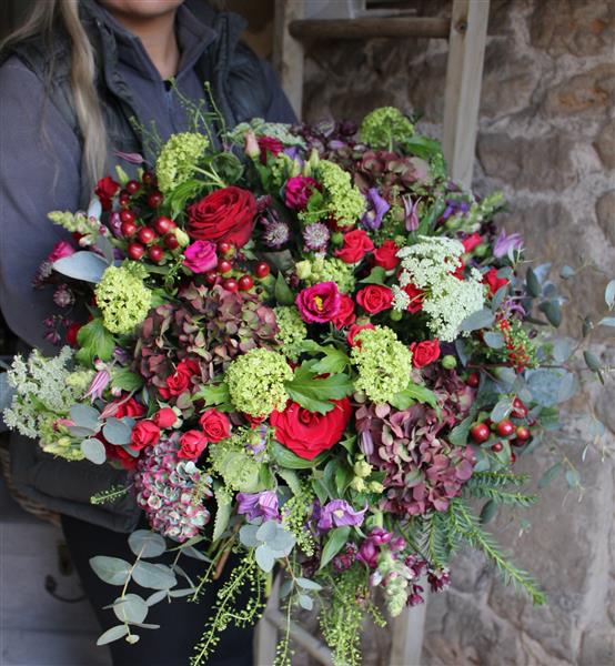 The "Ruby Red Symphony" is a symphony of passionate reds, hints of complimentary tones and seasonal foliages. Every bloom within this luxurious creation has been handpicked at the pinnacle of its beauty, ensuring that each petal exudes the vibrancy and passion of the moment.